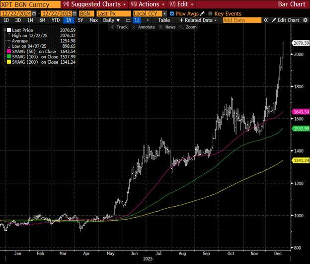 Como costumamos dizer, é preciso cautela ao confiar excessivamente nessas projeções. Caso não haja recessão em 2026 — o que ainda é o cenário-base para muitos analistas do setor — poderemos facilmente ver mais um ano de déficit, levando potencialmente a platina a novas máximas.