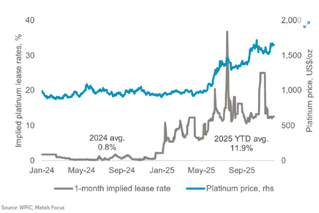 Por fim, de acordo com o WPIC, a taxa implícita de aluguel (lease rate) para empréstimo de platina com prazo de um mês saltou de cerca de 1% em 2024 para aproximadamente 12% hoje. O principal fator por trás disso é a escassez de oferta física. Essa dinâmica sustenta os preços e, juntamente com a alta do ródio, marcou o início do bull market no começo deste ano.
